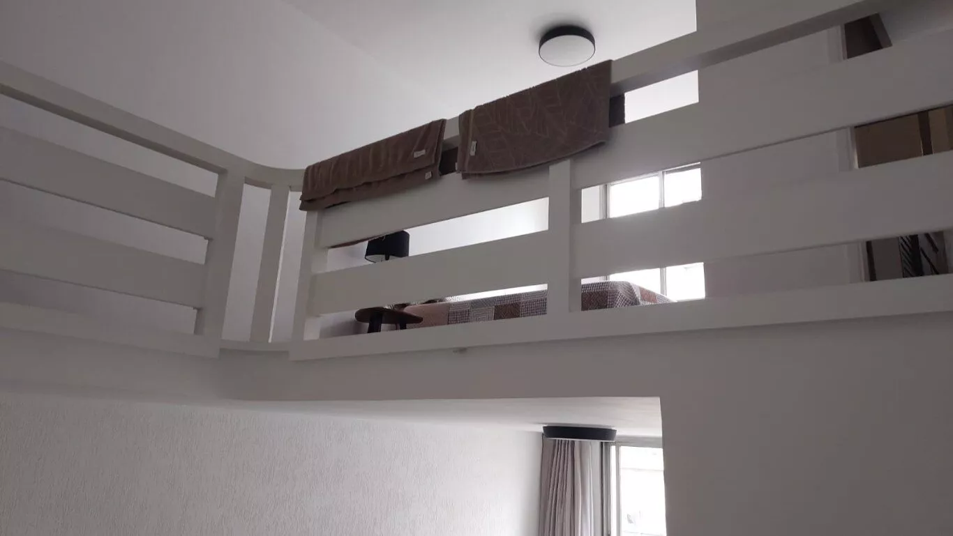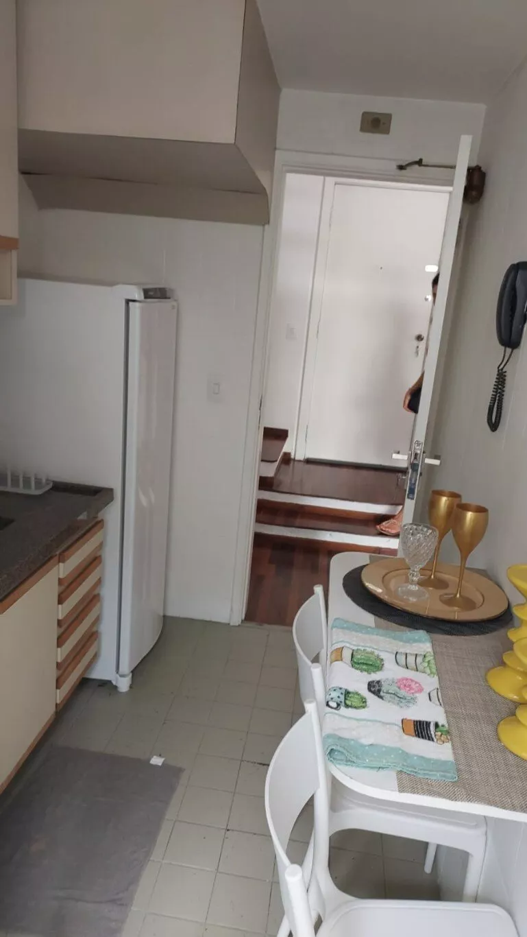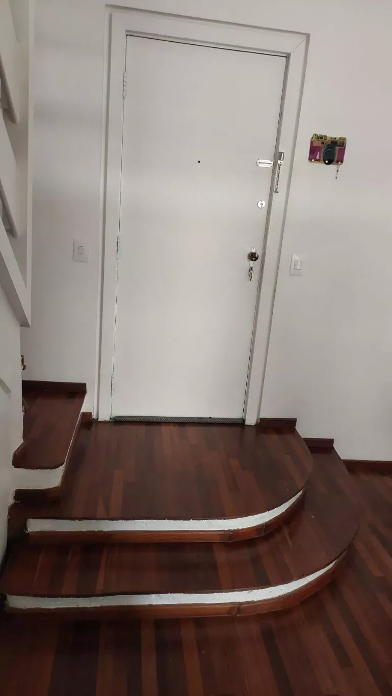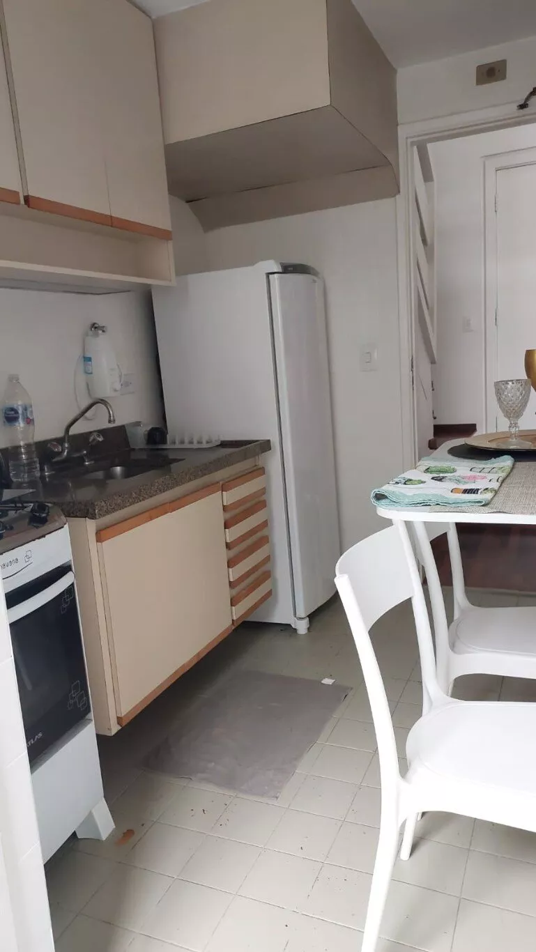 Duplex com uma suíte, closet, sala de estar e jantar, cozinha, área de serviço e dois banheiros.